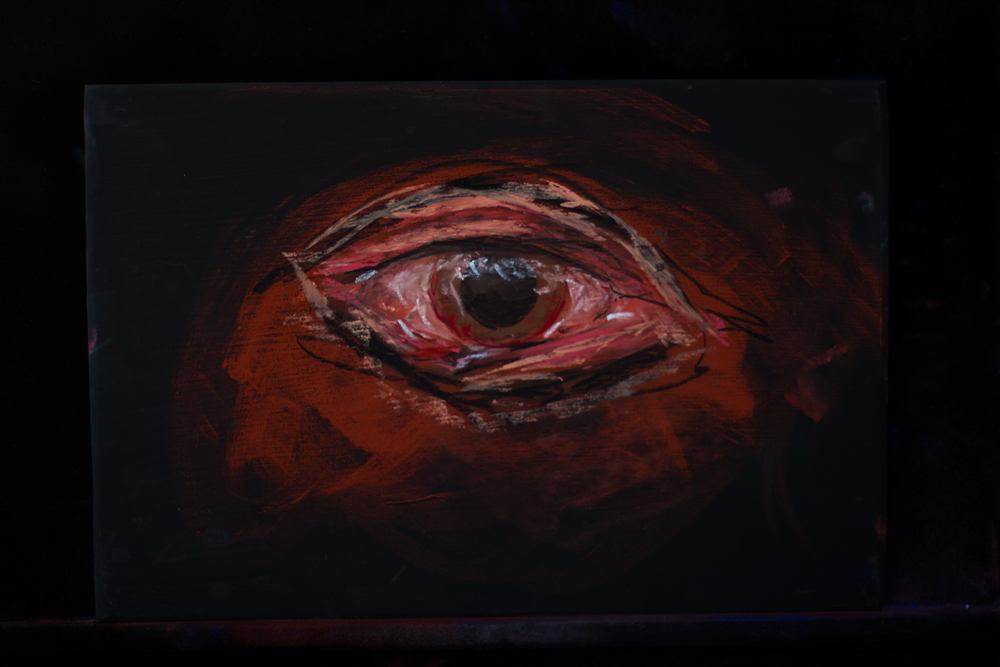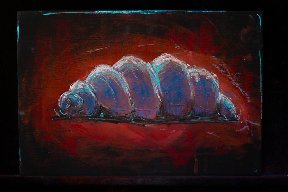 Ferric uses artist soft pastel onto wooden boards that they prepare themselves: they are cut, shaped, sanded, mounted, and applied with layers of primer using rabbitskin glue, calcium, and iron oxide. Ferric is exploiting traditional Western ways of working, from recipes in books so old that it forbade a woman’s company, to reconnect with agency and hands-on processes. This becomes a multimedia presentation as it is filmed and projected live and as it engages with performers during their acts: presenting a much-gate-kept Western form of art in a non-traditional way.