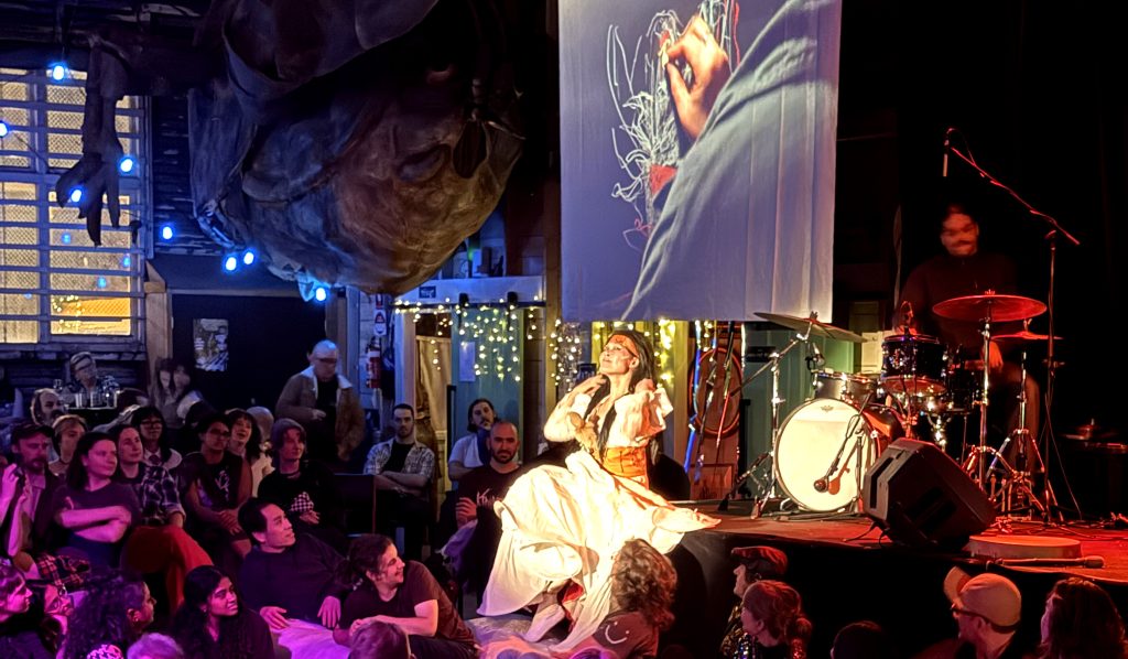 Collaboration with Blood of a Pomegranate for their performance with Bacchus Harsh, described as “ancient melodies meeting experimental noise in immersive, ritual-driven sonic necromancy: ‘Chthonosonic Necromancy’”. They raised the dead and summoned an underworld dragon, the Armenian Andndayin Odz (Abyssal Serpent/Black Dragon of the Dark Waters). It came through an Armenian viper, restless. The dead are moving, their searching eyes gazing toward the roots of the Tree of Life. It lifts a pomegranate to their outstretched hands. The waters ripple out from the world.