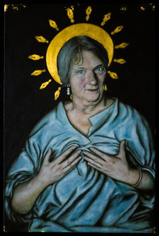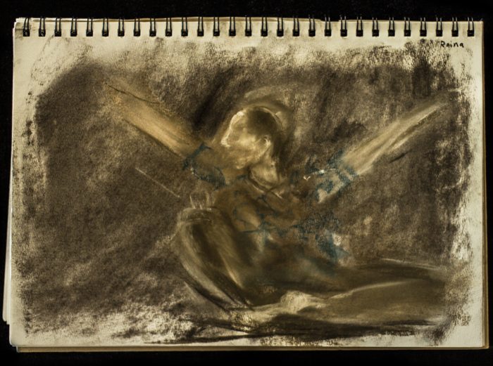 A screaming domestic sparrow wearing blue-green knitted socks with a googly-eye.