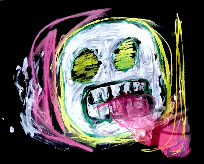 A receipt from Savers stapled next to a wood-framed canvas of Jingua Qian. Inside the frame, pink, beige and green blocks are evenly spaced over a white unprimed canvas. Over the top of these blocks, in the middle of the canvas, Jinghua is seated in a carved wooden armchair looking at their laptop. The impression of eir restless movements, like visual echoes, are messily painted next to eir head and elbows and shoulders. There are impressions of sections of objects in the background, a bike wheel, some books, a fire extinguisher. Hanging over the top left corner of the painting is a price tag for $4.49 from Savers - the original tag for the canvas.