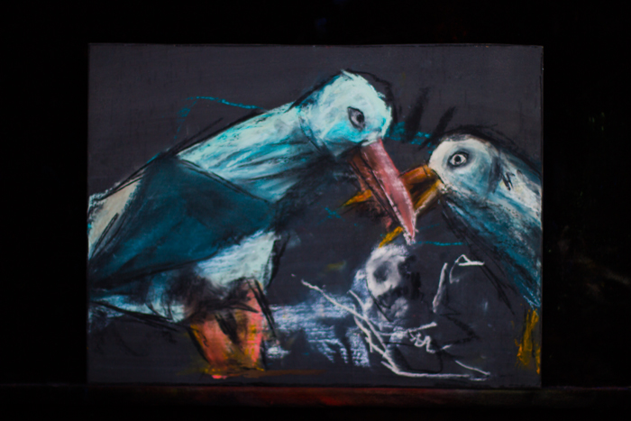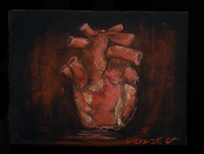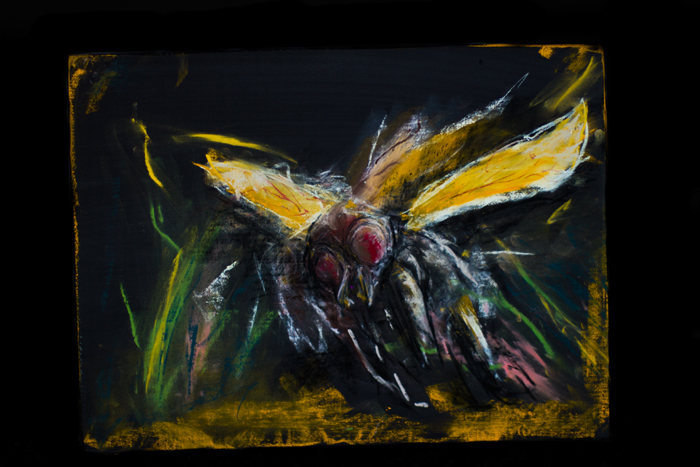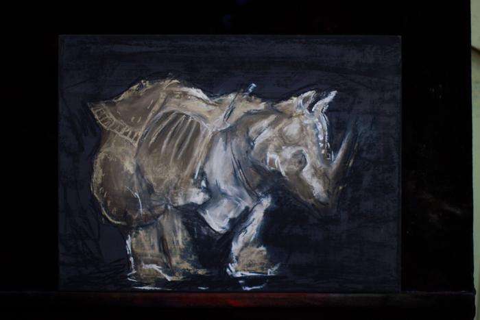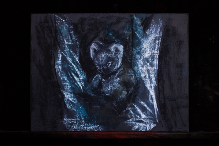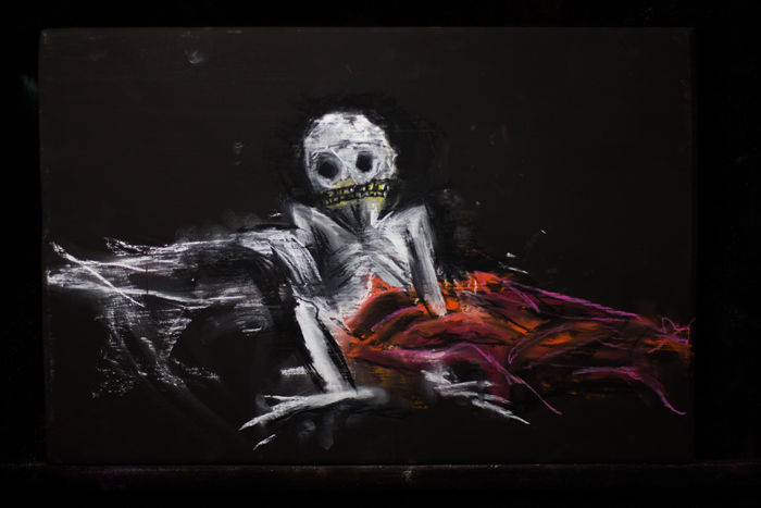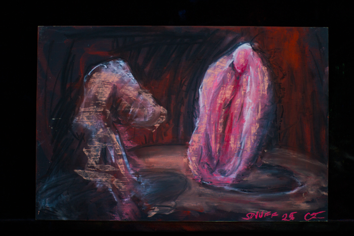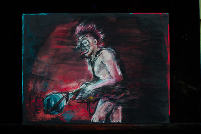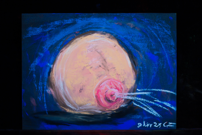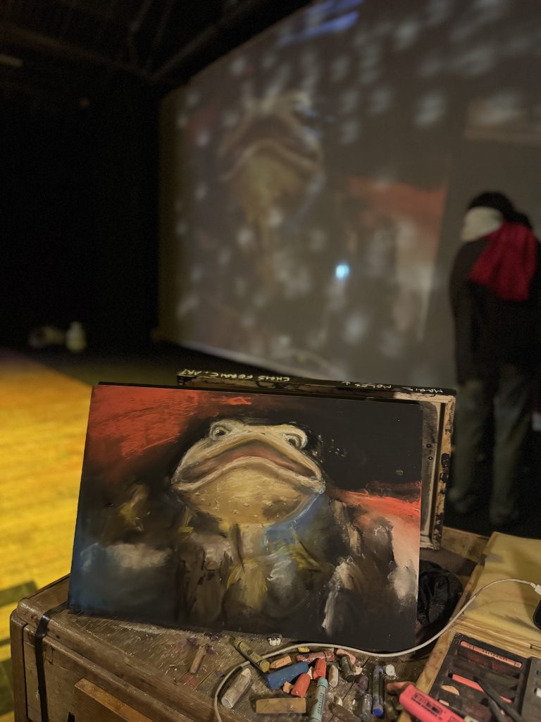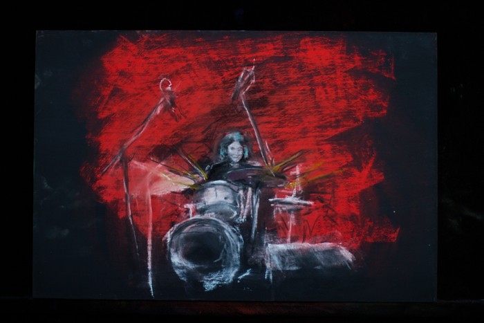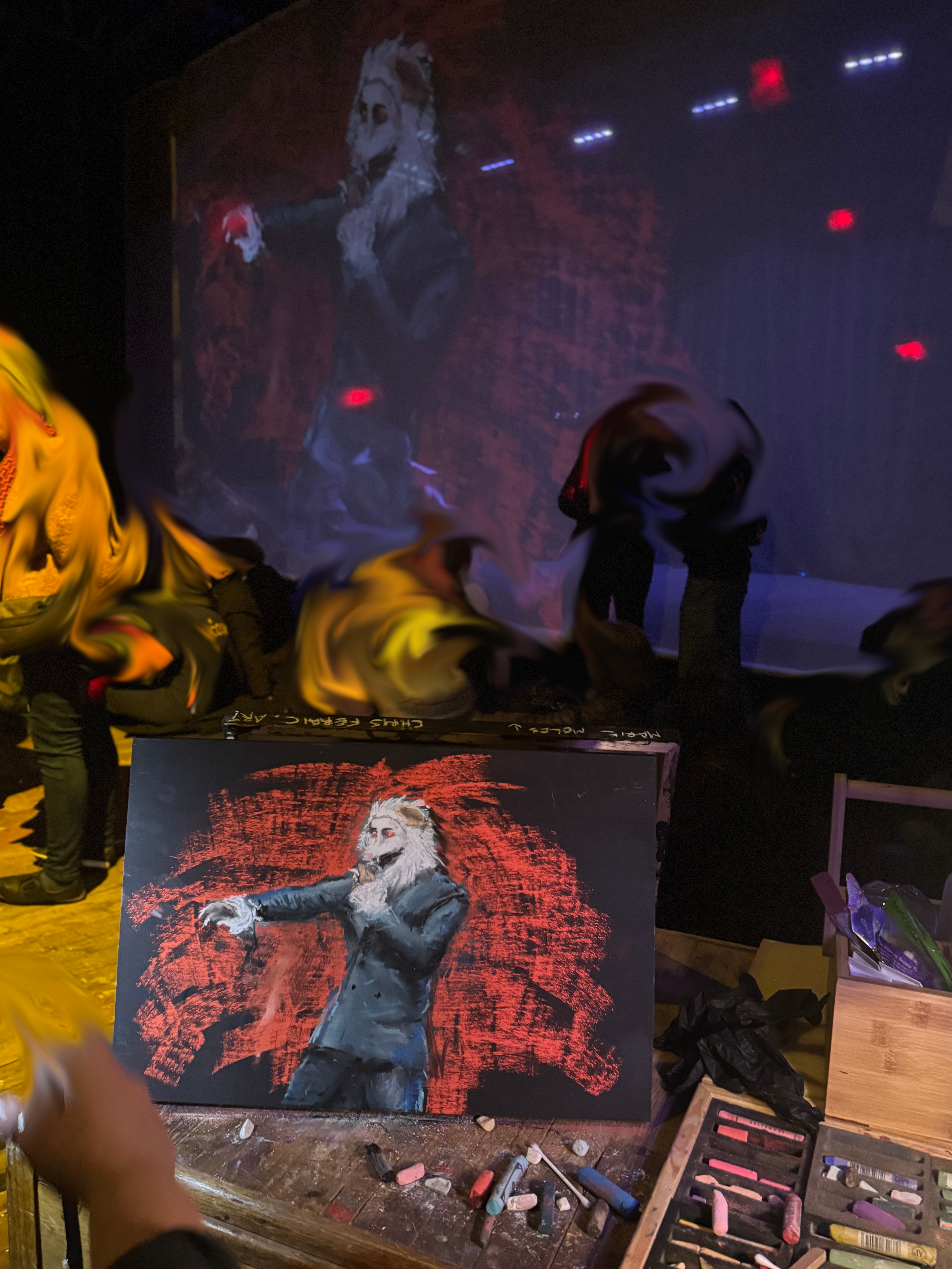 Ferric uses artist soft pastel onto wooden boards that they prepare themselves: they are cut, shaped, sanded, mounted, and applied with layers of primer using rabbitskin glue, calcium, and iron oxide. Ferric is exploiting traditional Western ways of working, from recipes in books so old that it forbade a woman’s company, to reconnect with agency and hands-on processes. This becomes a multimedia presentation as it is filmed and projected live and as it engages with performers during their acts: presenting a much-gate-kept Western form of art in a non-traditional way.